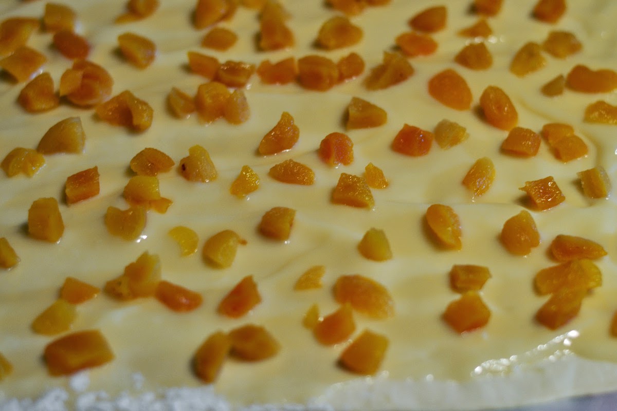 Затем обильно присыпать курагой. Можно добавить орехи, изюм, клюкву сушеную.