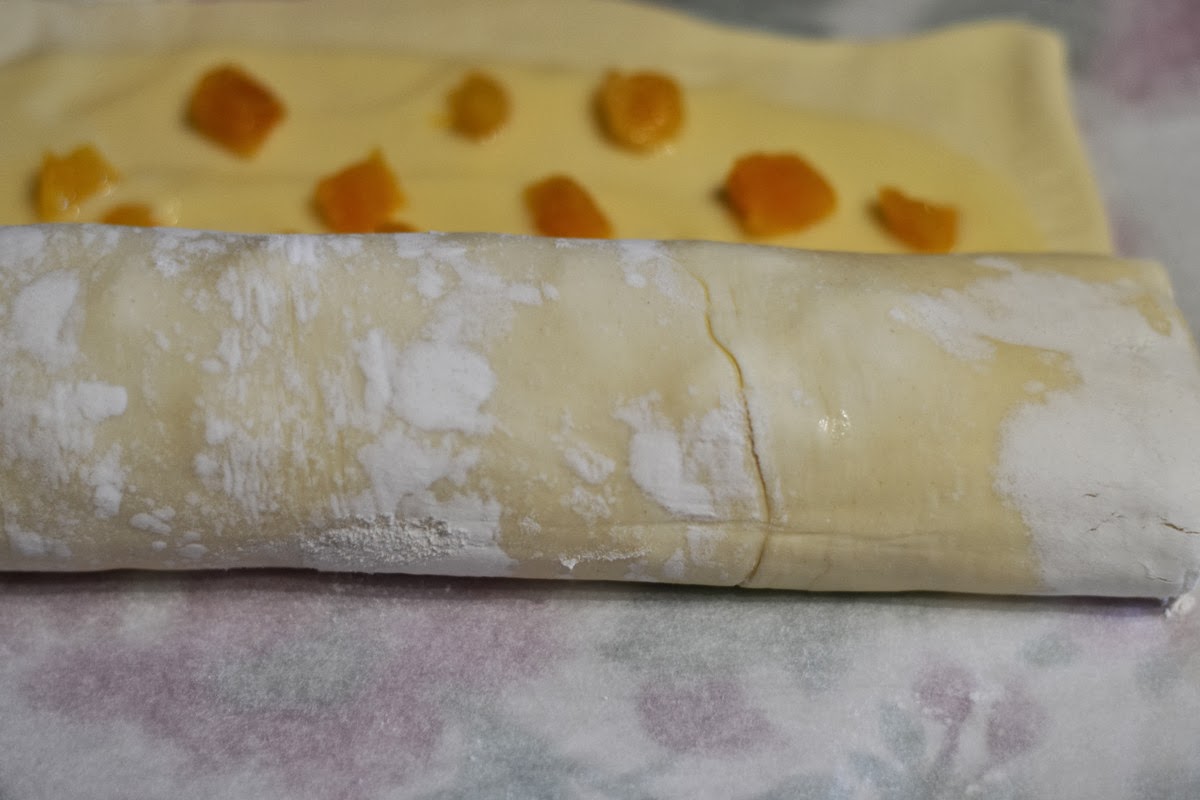 Готовое слоеное тесто на присыпанной мукой рабочей поверхности раскатываем в прямоугольник .