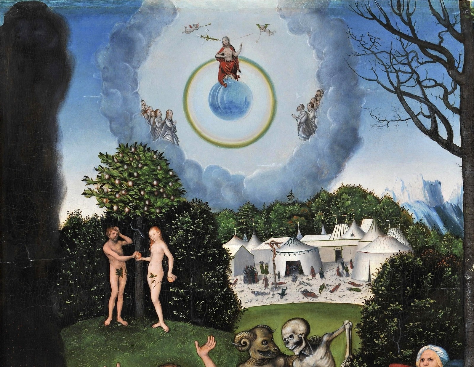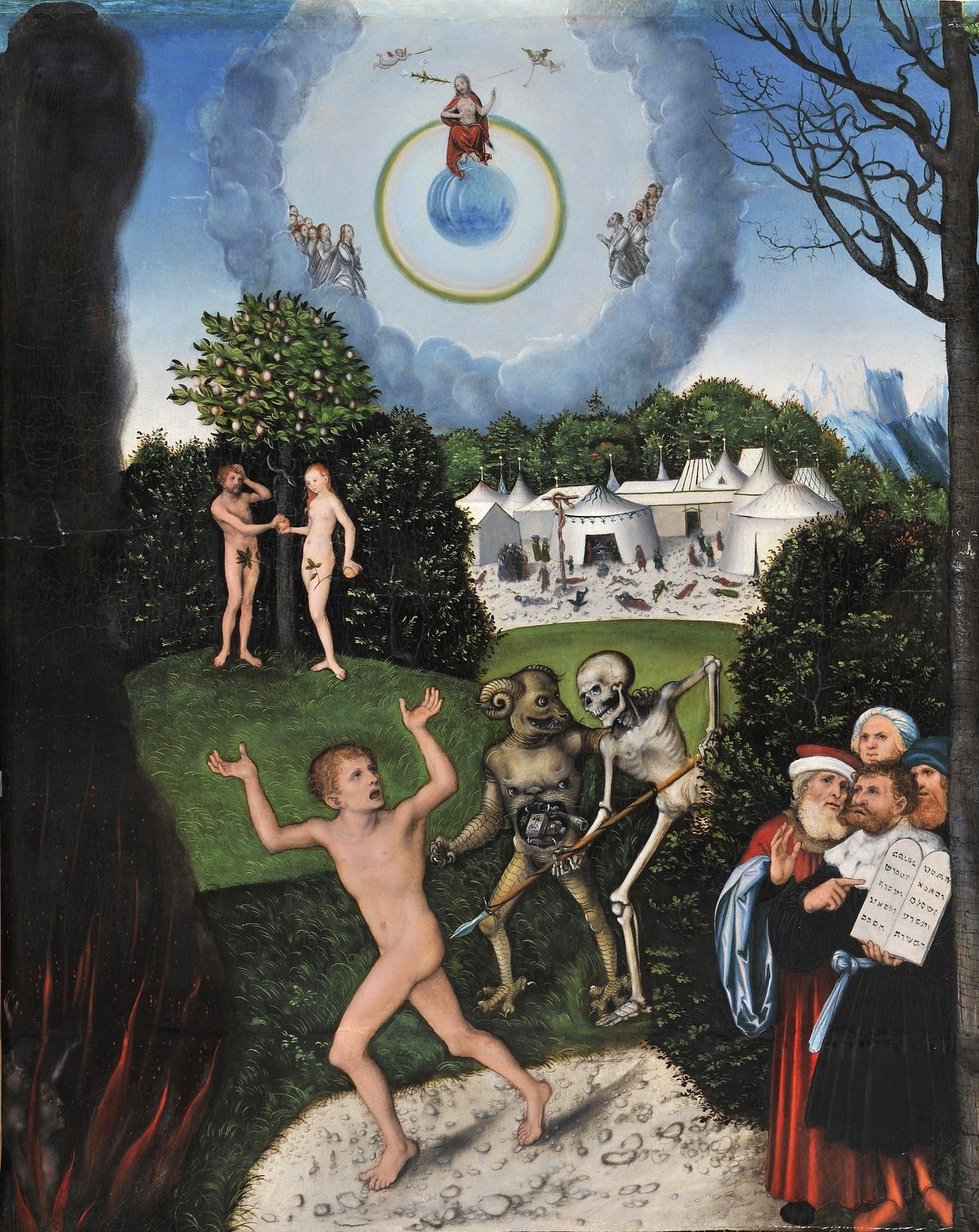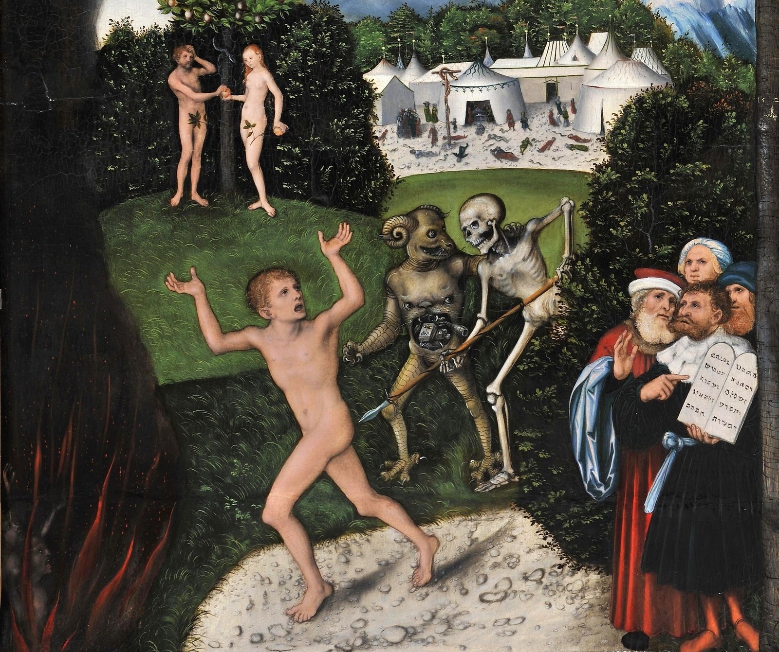 На левой стороне смерть и дьявол загоняют вопящую душу в ад рядом с группой пророков, включающую Моисея, указывающего на белые скрижали с текстом закона. Мотивы на левой стороне композиции призваны проиллюстрировать идею о том, что один только закон без благодати никогда не сможет поднять вас на небеса.