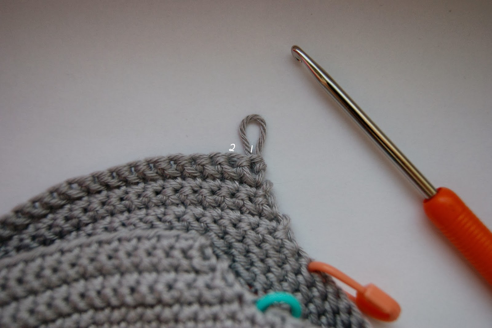 тут я пронумеровала петли... вводим во вторую петлю крючок, видите какой скос получается ровный |