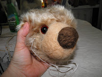 6.Отрываем по кусочку кордачеса и начинаем обваливать всю моську равномерно вокруг носа.И с этого момента все время проверяем симметричность нашей набивки.Если кто занимался скульптурой(помнте лепку головы)-проверяем симметричность по 4 точкам-смотрим на макушку,смотрим фас,смотрим со стороны подбородка и профиль.Используем среднюю иголку.Не бойтесь,если вам покажется что слишком большие дырки от иголки-они уйдут,да и дорабатывать мы будем тоненькой иголочкой.