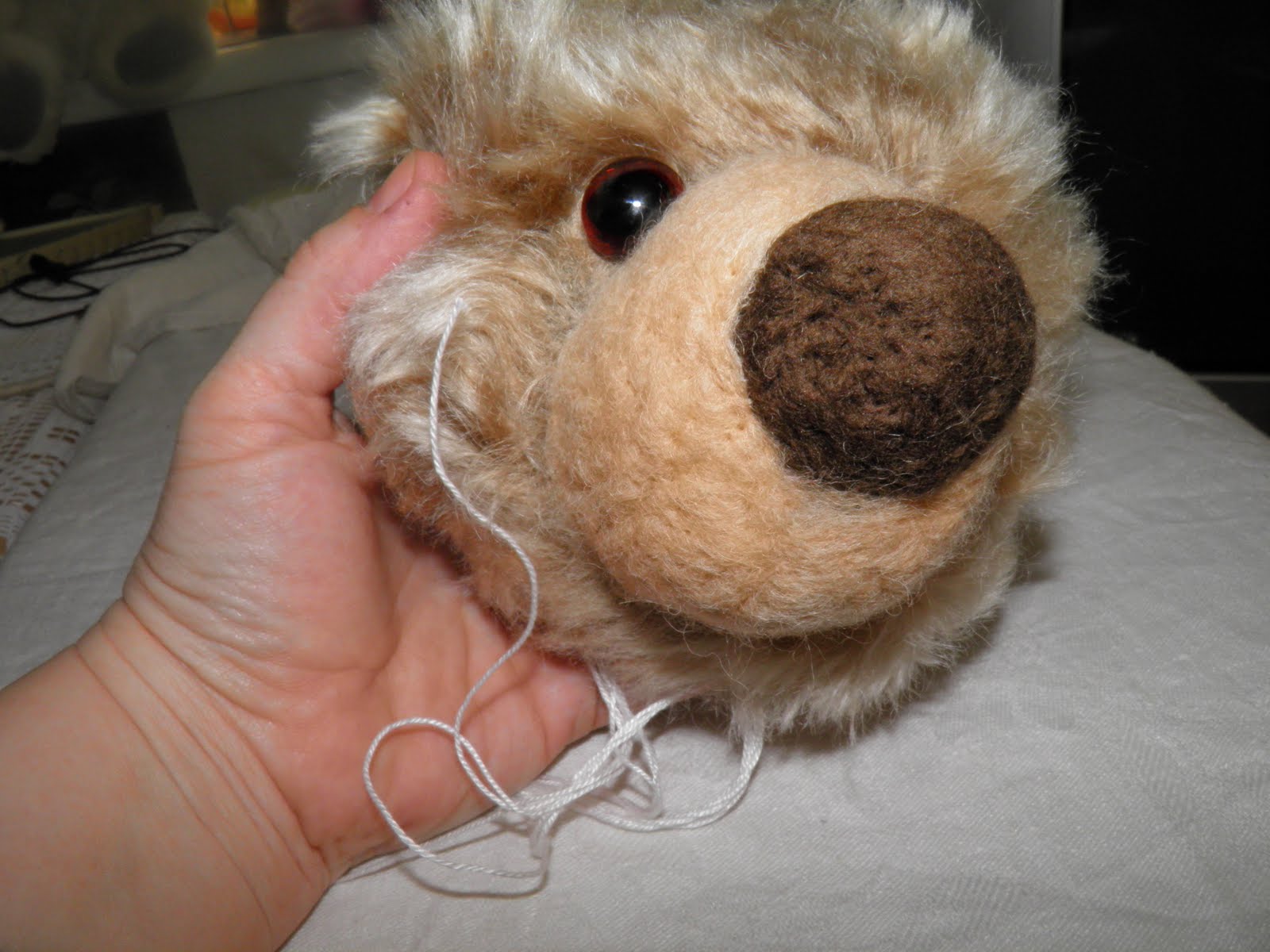 И вот теперь-все зависит от того,каким вы видите мишку-насколько широка у него улыбка,какие щечки-пухленькие или не очень.Лепим шерстью.не забывая проверять симметричность набивки.Выполняем паралельно набивку парных мест-щечек,уголков ротика.Смотрите на голову с разных сторон(4 точки).Я помогаю себе даже пальцами,приглаживая кое-где шерсть.Вначале средней иголкой,потом когда определились что обьема достаточно-полируем тоненькой иголочкой.
