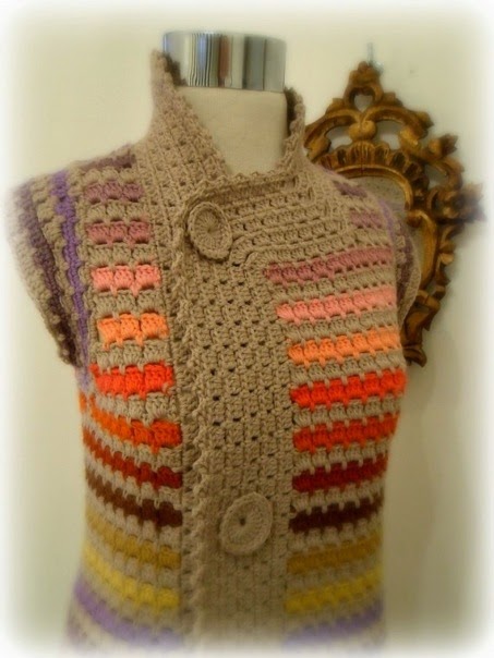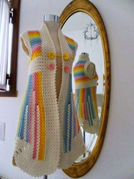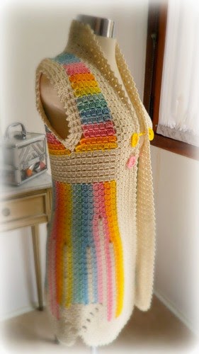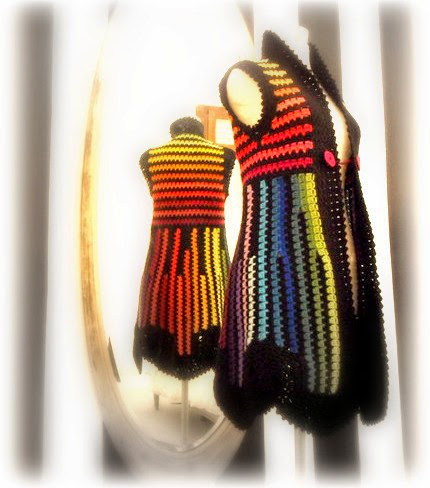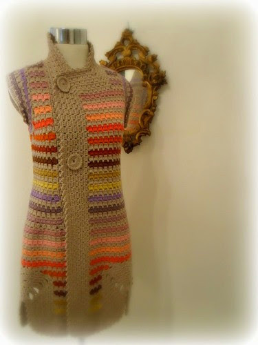 The same interesting, simple but versatile pattern is used by Mariana in a large combination of colors, with ombre effect to create stunning looking coats and vests.