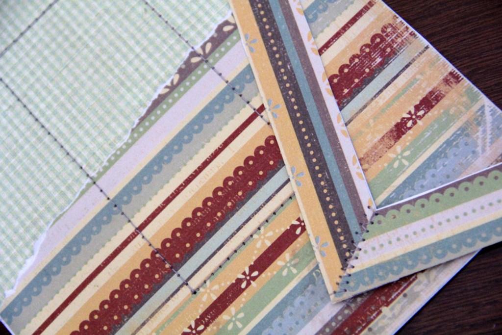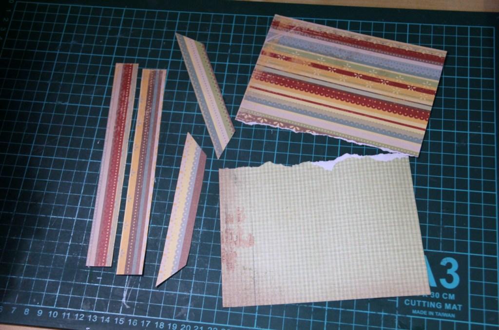 Также из скрап бумаги вырезаем рамку. Размеры те же, что и для основы из акварели, только у маленьких отрезов делаем скос (см фото) по 2 см.