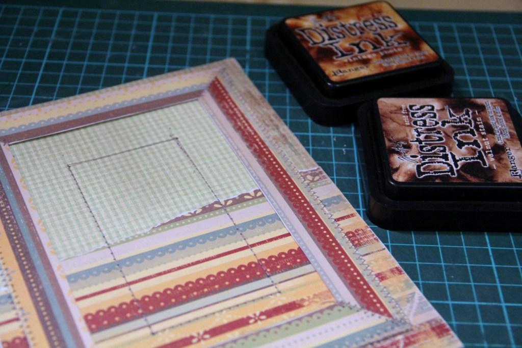 Будем делать фоторамку для фотографии 10х15 см. Для работы нам понадобятся: картон переплетный 1-2 мм (у меня 2 мм), макетный нож, бумага для акварели, скрап бумага, дистресс чернила 2-х цветов, ножницы, клей, клей-карандаш, простой карандаш, линейка, транспортир, 2 листа А4, окрашенных кофе или чаем, 4 брадса, крепеж дверной.