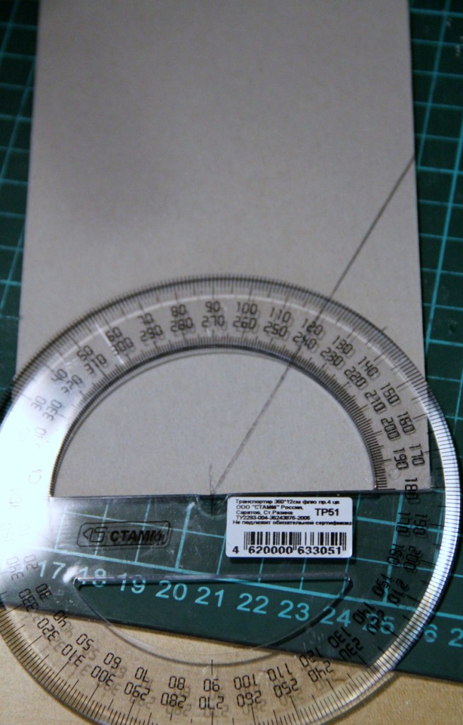 Поворачиваем заготовку, отмеряем вверх по краю 5 см и ставим точку. От этой точки отмеряем угол 50 градусов. Проводим линию через отмеченную точку.