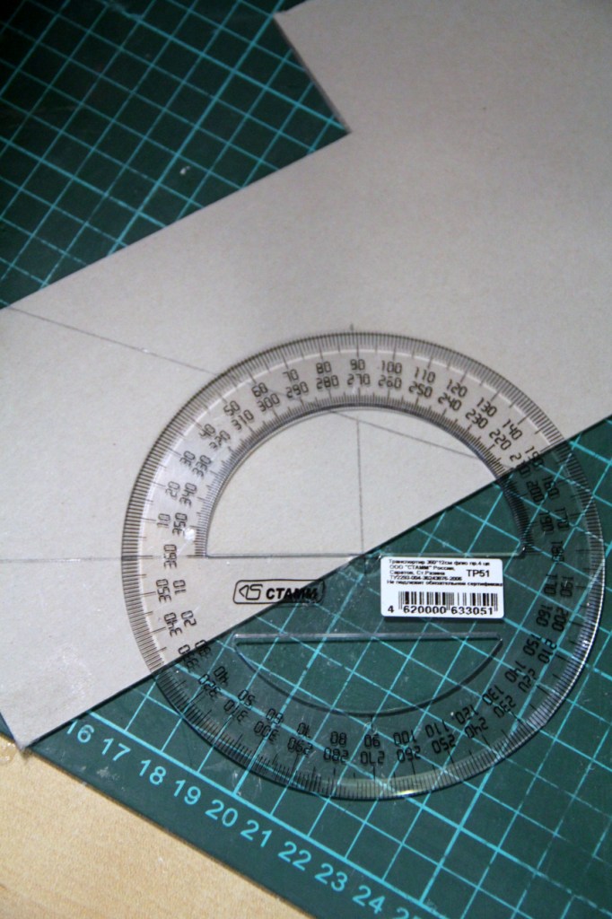 Начинаем строить держатель для фоторамки. На оставшемся листе картона, от крайнего угла, отмеряем 5 см и ставим точку. Прикладываем транспортир к этой точке и отмеряем тупой угол 120 градусов. Через полученную точку, чертим линию нужного размера (я провела до конца картона).