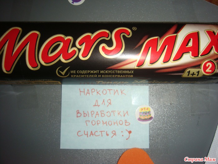 - ШОКОЛАД. В нём содержатся вещества, способствующие выработке гормонов радости и счастья. А счастья должно быть много и ещё чуть-чуть. Так и напишем: «Для выработки гормонов счастья» и «И ещё немножко для полного счастья»