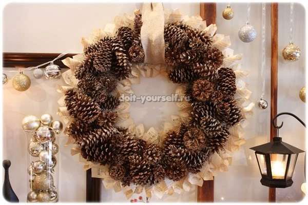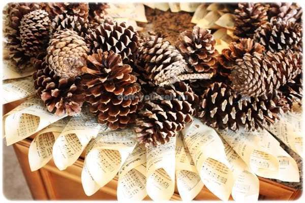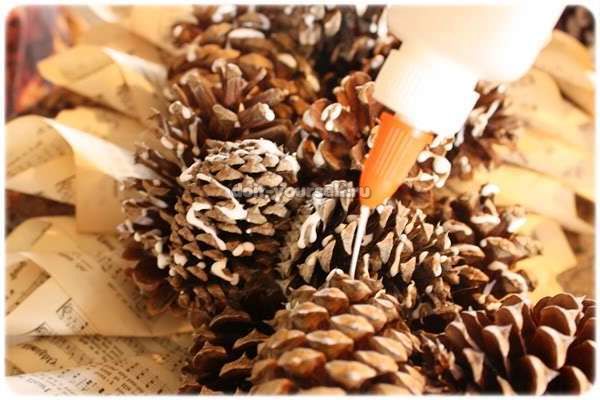 Мастер-класс 1: Венок из шишек декорированный с помощью листов из книги..