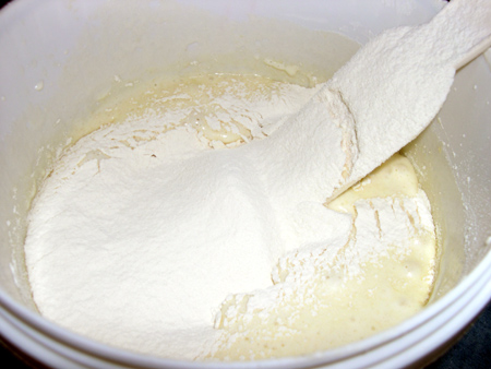Миксер остановить и убрать в сторону. Через ситечко добавлять понемногу муку, просеивать в массу и очень аккуратно вмешивать лопаткой таким образом, чтобы масса стала однородной.