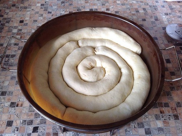 3. Уложить начинённые вишней колбаски спиралью в форму и выпекать при 200 градусах до румяного цвета, примерно 30-40 минут. Пирог вынуть из формы, посыпать сахарной пудрой.