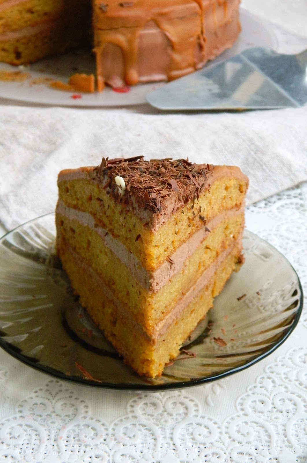 морковного торта. Везде там фигурирует сливочный крем, который дает идеальное сочетание. Но на этот раз я уже знала, что тыква и шоколад сочетаются не хуже, а карамель вообще для меня «вкус осени». Нужно было только определиться с текстурой торта. Мне хотелось воздушного крема, поэтому добавление растопленного шоколада в сливочный сыр отмелось, потому что он все же крем утяжелят. Его я заменила какао. Вышло отлично! Мне казалось, что крема в прослойке будет мало, но когда я разрезала торт, то была удивлена его приличному количеству. Видимо двойная начинка все же добавила объем. Да-да прослаивала торт я не только кремом, но и карамелью! А результат? Настоявшись ночь в холодильнике, этот негодяй начал искушать меня какими-то сумасшедшими ароматами! Я прям уже и не знаю, что еще написать, но хочется не прекращая говорить, какой же он вкусный :)