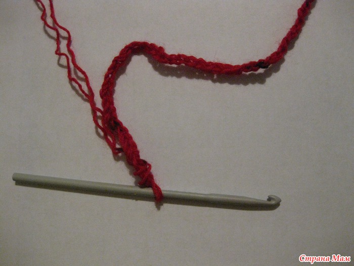 Отсчитываем от петли на крючке 10 петель и 11 воздушную петлю провязываем СБН, т. о. закругляя первый ряд.