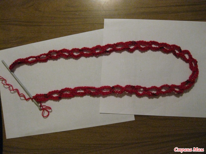 Так вяжем до конца цепочки, заканчивая соединительным столбиком. Получается вот такая цепочка, это основа шарфа: