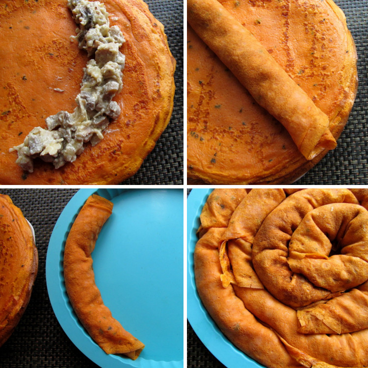 В форму по спирали выложить блины, от бортов к центру.