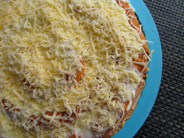 Пирог залить сверху заливкой и посыпать тертым сыром.