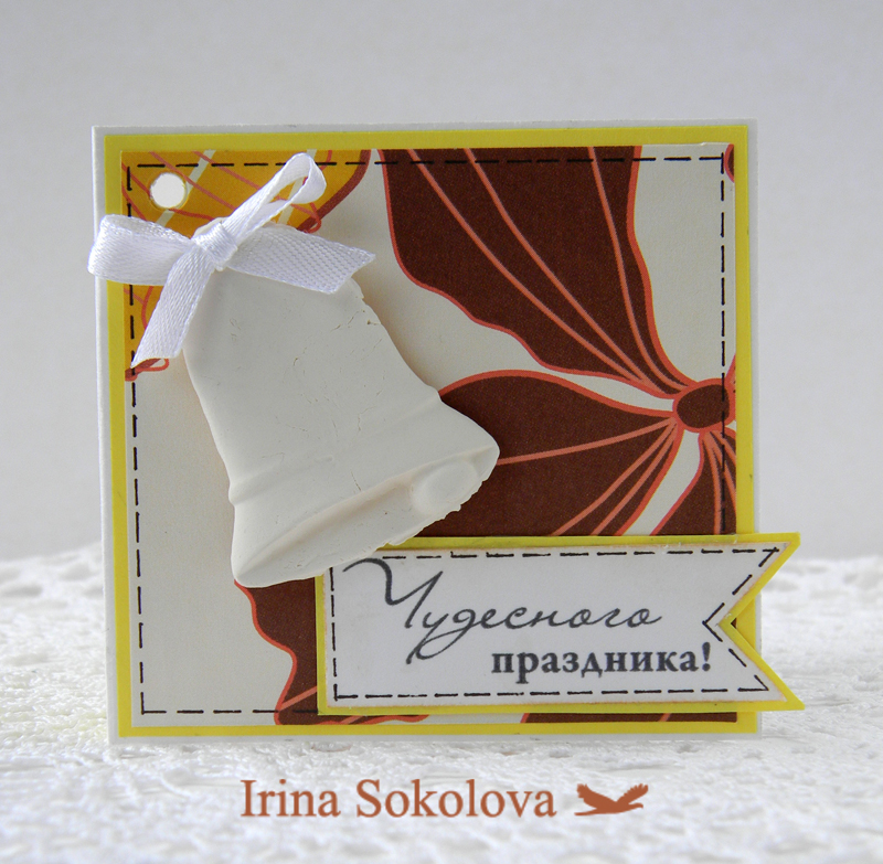 Ну а я к этому празднику сделала осеннюю мини-открытку с колокольчиком. (она, признаться, не единственная открытка из цикла "школьная пора", но показать мне захотелось именно ее, т.к. она в оттенках осени)