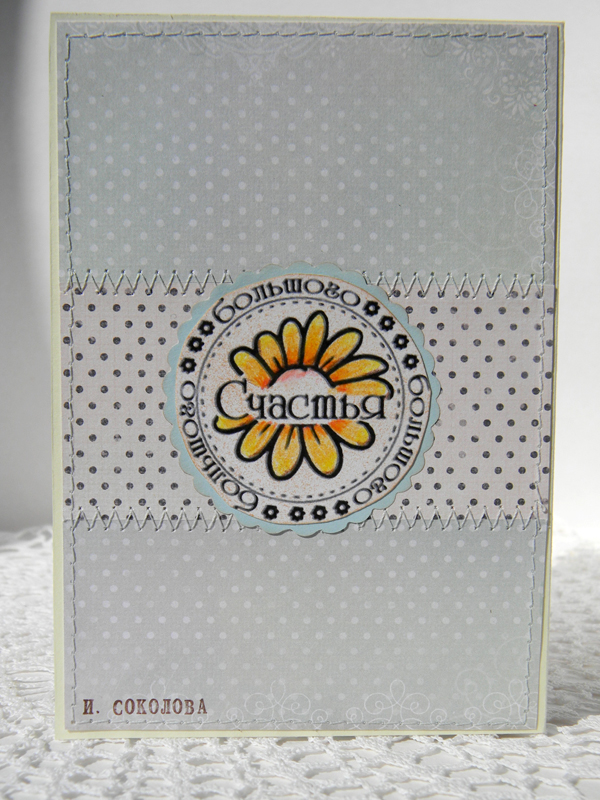 Я взяла бумагу от Melissa Frances и картинку от G45. Вырезала, прострочила на машинке и приклеила на заготовку для открыток от ScrapBerry's. Цифру, которая заменила цветок в скетче вырезала из той же бумаги, что и сама открытка и приклеила на подложку, прошлась жидким жемчугом. Надпись-распечатку, которую вместо полукруга сделала в виде двустороннего флажка, посадила на подложку в тон бумаге и также прошлась жидким жемчугом. Затем приклеила кружево в виде детских лошадок и полужемчужины.