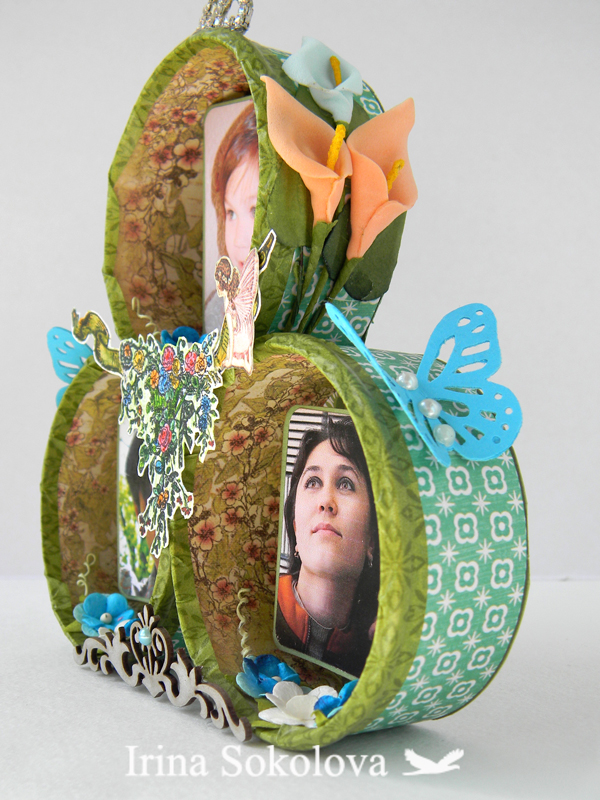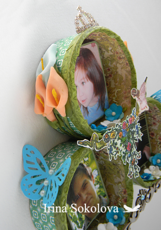 Первоначально все задумывалось под одного человека. Естественно, Аню ))) Позже, перелопатив архив с ее фото пришла к выводу, что гармоничнее рамочка будет смотреться не с ней одной, а с нашими фотками. Пусть и по отдельности. Обклеила чертежной бумагой банки изнутри, после чего скрапбумагой, приклеила наши фотки на подушечки, предварительно "посадив" их на подложки из бумаги для пастели и приступила к украшениям. Разукрасила вазу с цветами и развевающиеся флаги акварельными карандашами. Это мой новый набор штампов. Флаги от вазы отдельно, но я их соединила))) Затем приклеила при помощи горячего пистолета цветы по бокам и внутри, корону, доставшуюся "по наследству" от какой-то или обуви или еще чего.