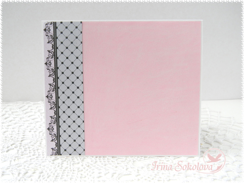 Это сзади. Здесь у меня не хватило розовой бумаги нужного размера и я отрезала офисную розовую бумагу и для придания нужного рисунка, на шершавой поверхности дочиного стола хорошенько прошлась белым акварельным карандашом по ней. "Рисунок" стал "похож" на оригинальную бумагу.