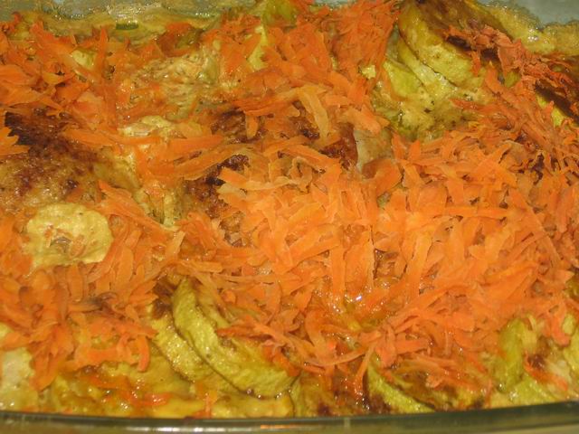 Сверху присыпаем морковкой, заливаем всё сливками или молоком. Не надо много. Достаточно 1 стакан.