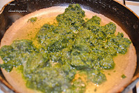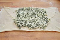 Для сырной начинки размороженный шпинат припустите на сухой сковороде, чтобы жидкость испарилась и дайте ему остыть.