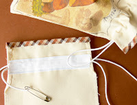 6. Края мешочка обошьем полосой холста шириной 4 см, выкроеной по косой. Полоску приложим к верхнему лицевому краю мешочка и приблизительно 1 см от края приметаем и пришьем на машинке. Мешочек вывернем лицом внутрь и прошьем по сторонам, оставив непрошитыми приблизительно 7 см справа и слева