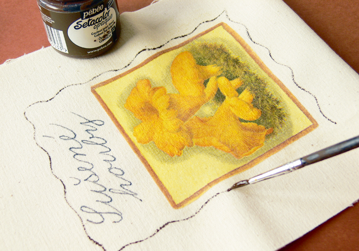 5. На различные виды грибов можно сшить несколько мешочков . Картинки объединим одинаковой надписью и одинаковыми рамочками у приклеенных картинок. Кисточкой, намоченной в текстильную краску, нарисуем, например, волнистую рамочку. Примерно через час сушки приклеенной картинки и текстильных красок зафиксируем все горячим утюгом. Гладим в течение 3-5 минут утюгом, наставленным на хлопок, с задней части ткани или с передней стороны через бумагу для печения.