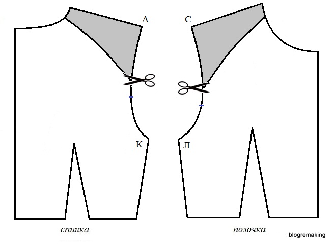 Теперь разрежем полочку по намеченным линиям и переведем часть нагрудной вытачки в линию проймы на такую же величину раствора как и на спинке. Оставшуюся часть нагрудной вытачки переведем в талевую.