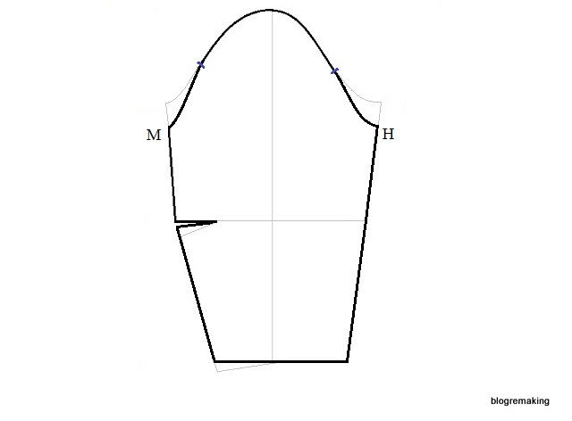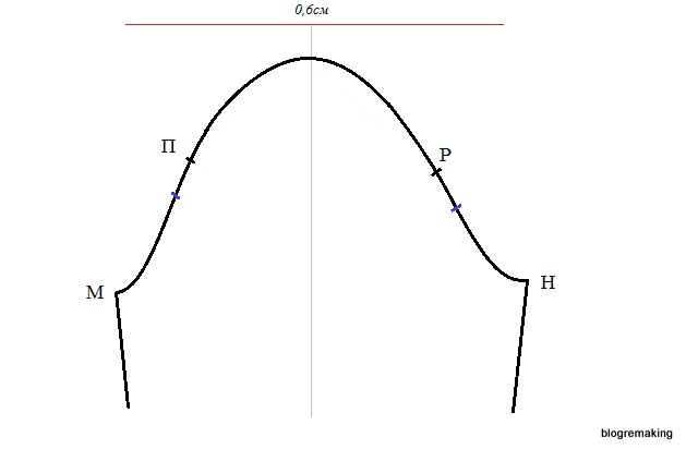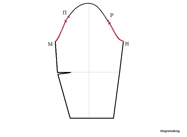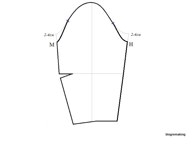 Так как мы углубили пройму на 2-4см, на эту же величину нам нужно увеличить высоту оката рукава. Для этого по срезам рукава от линии оката отложим по 2-4см вниз, полученные точки обозначим М и Н, которые соединим плавными линиями с контрольными точками оката.