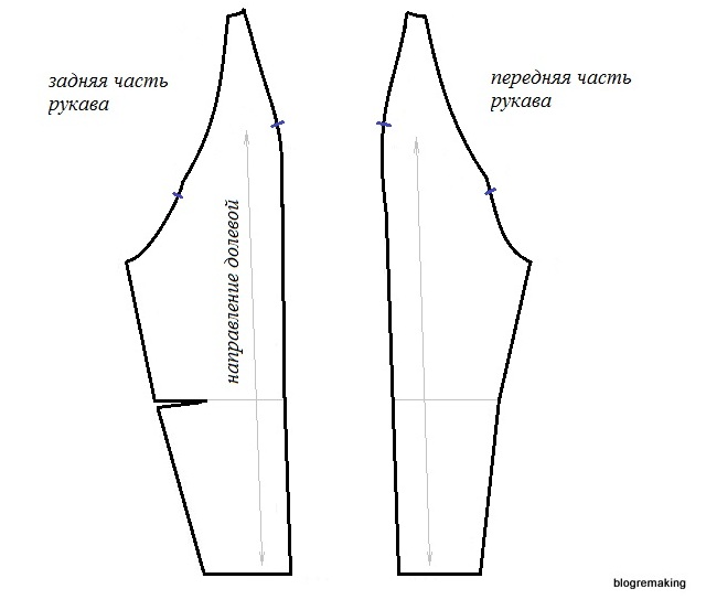 На чистом листе бумаге обведем по контуру выкройку одношовного рукава, перенесем линию середины рукава, локтевую линию и контрольные точки оката рукава. Удлиним линию локтя на 0,6см от переднего среза.