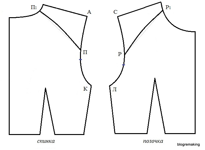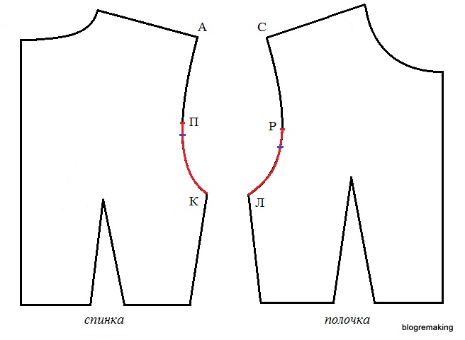 На спинке лифа от точки К отложим половину проймы АК минус раствор плечевой вытачки, полученную точку обозначим П. Точно также на полочке разделим пополам линию проймы СЛ, вычтем раствор плечевой вытачки, а полученный результат отложим вверх от точки Л и обозначим точку Р.