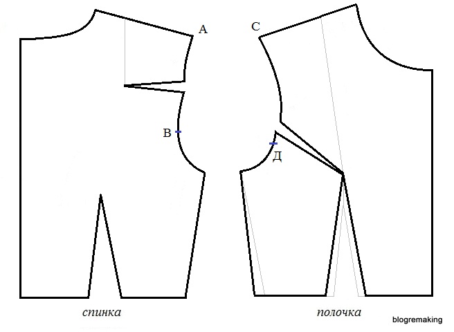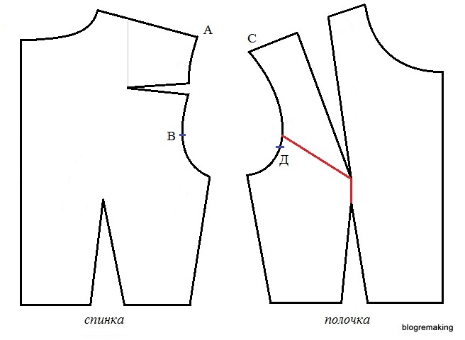 Разделим линию проймы спинки на участке АВ пополам и соединим полученную точку с вершиной плечевой вытачки. На пройме полочке вверх от контрольной точки Д отложим 1-2см, полученную точку соединим с вершиной нагрудной вытачки. Также соединим прямой линией вершины нагрудной и талевой вытачки.