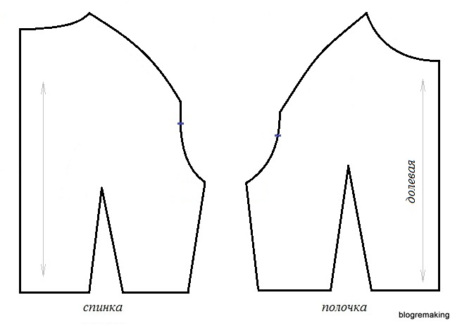 Таким образом мы удлинили линии проймы спинки и полочки на одинаковую величину.