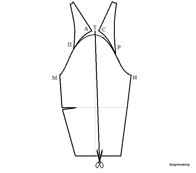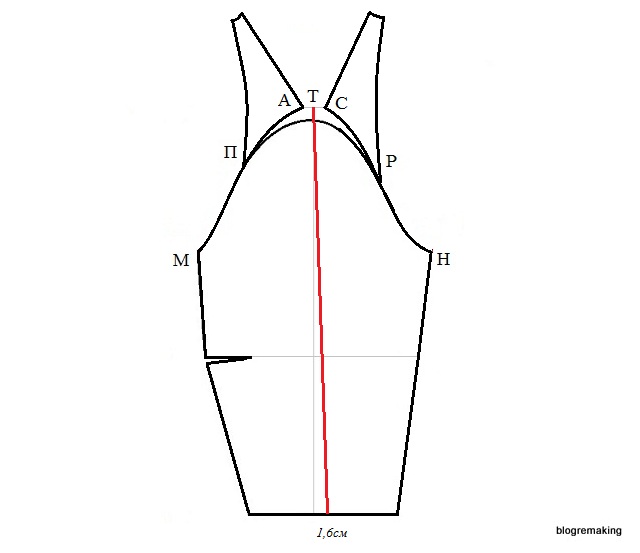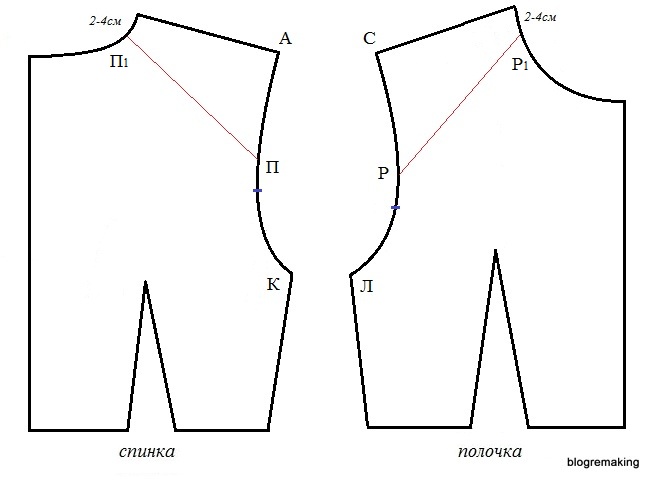 По линиям горловины полочки и спинки от плечевого среза отложим 2-4см и соединим полученные точки вспомогательными линиями с точками П и Р.