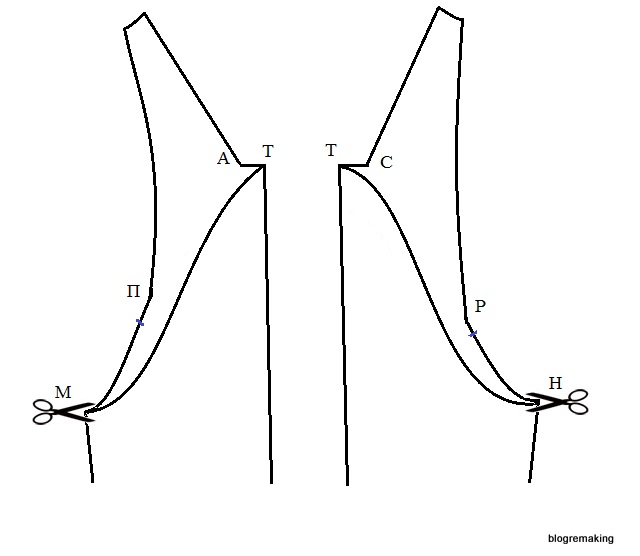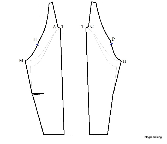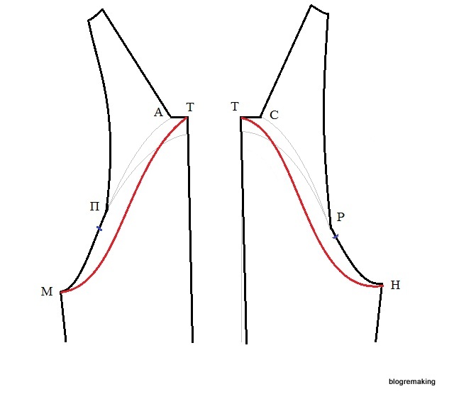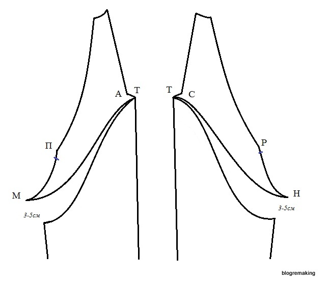 Теперь у нас получились две части рукава — передняя и задняя. На обеих частях плавными линиями соединим точки М и Н с точкой Т.