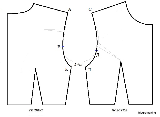 Теперь углубим линию проймы спинки и полочки по боковым срезам на 2-4см, полученные точки обозначим К и Л. Начертим новые линии проймы, соединяя плавными линиями точки А, В и К, а на полочке — С, Д и Л.