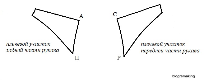 Теперь приложим верхние участки частей рукава так, чтобы точки П и Р плечевых частей совместились с точкам П и Р на окате рукава, а точки А и С оказались на вспомогательной линии.