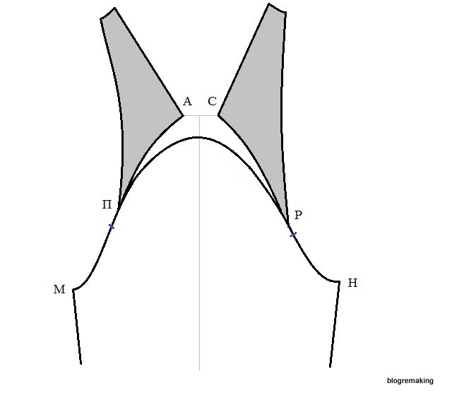 Вверх от точки М отложим по линии оката величину, равную длине дуги АП плечевого участка, и поставим точку П. Вверх от точки Н отложим величину дуги СР плечевого участка и отметим точку Р.