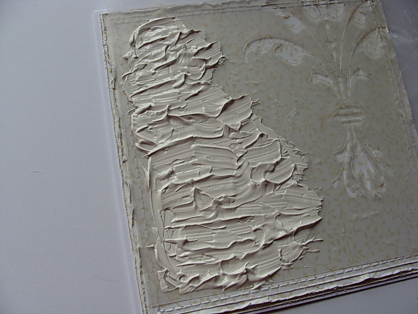 Наложить гипс на шаблоне. Я намеренно ввести кистью, а не лопаточкой, чтобы картина была równiutkiej неравномерно после загрузки шаблона.