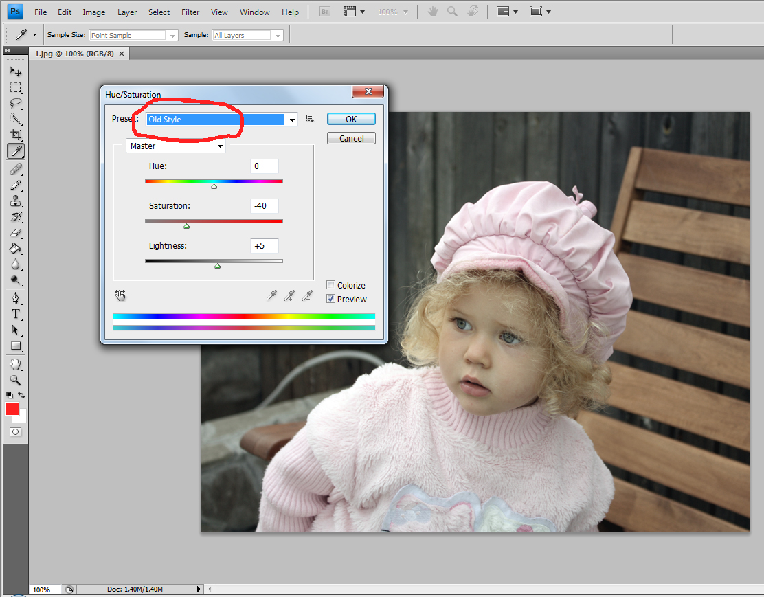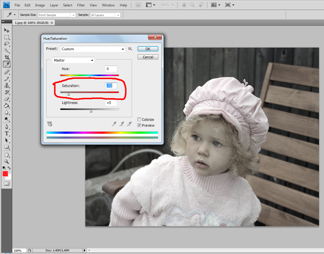 Снова вызываем окно Hue\Saturation и двигаем бегунок Saturation влево, уменьшая цветность фотографии до тех пор пока не получите желаемый цвет.