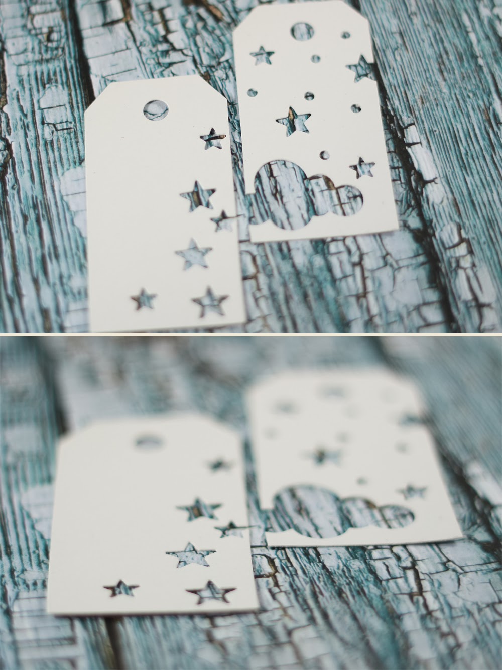 И теперь начинается самое интересное! Я очень люблю эти ножи-тэги, и они всегда так и просятся в работу. На одном я вырубила в углу маленькие звездочки, а на втором изобразила что-то вроде звездного неба, еще и облачко вырезала.