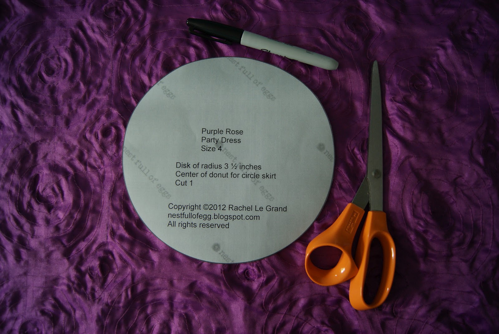 :: От 1 ярд рядами розеток ткани вырезают выкройки на изнаночной стороне ткани: 1 передняя лиф, 2 части назад лифом и юбкой 1 круг. Для окружности юбки вырезать круг с 3.5 "радиуса, то 10" от этой вырезать еще один круг (я использовал черный перманентный маркер и линейка), в конце концов вы будете иметь форму тора с 27 "диаметра.