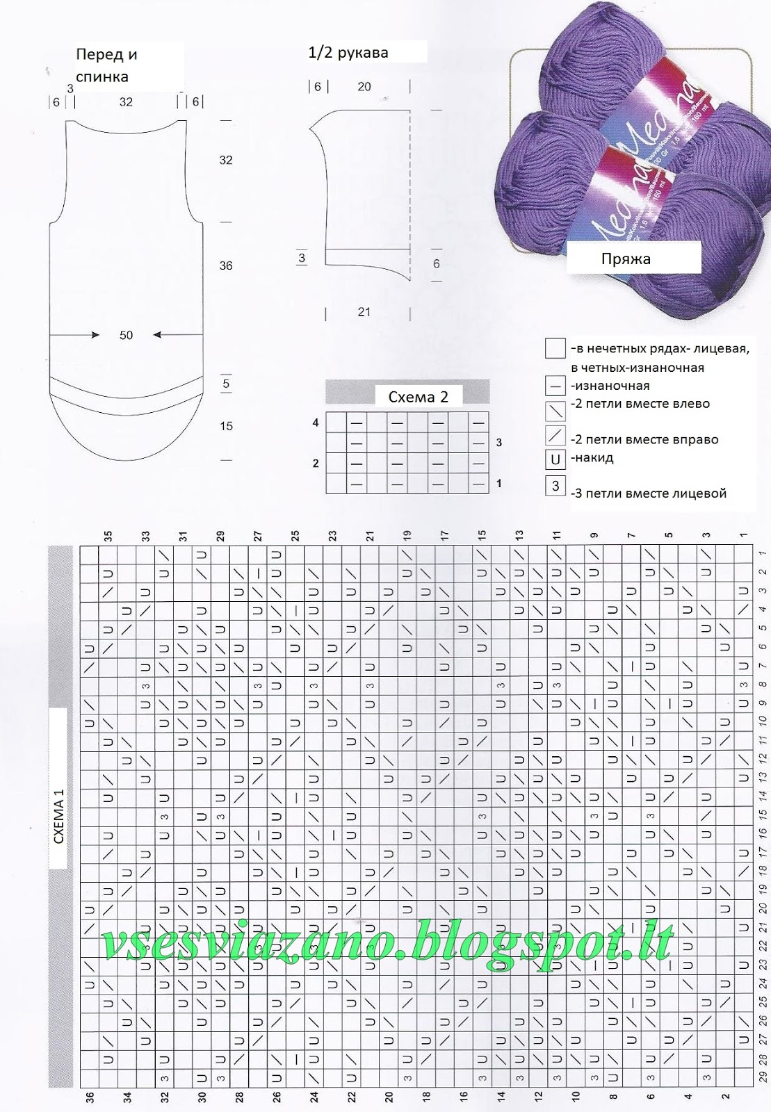Наберите 5 см и вяжите жемчужным узором по схеме 2. В каждом втором ряду добавьте 6 раз по 5 петель с обеих сторон и еще раз по 1 петле. У нас получится удлиненный "хвостик" спинки, которая будет длиннее переда. Всего должно быть 87 петель. Далее вяжите так же как и перед основным узором по схеме 2 до самого верха без углубления для выреза. Все петли закрыть в одном ряду.