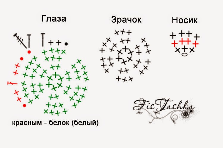 Далее вяжем глазки. Вначале радужку выбранным цветом - у меня - зеленый, потом обвязываем белым и черным цветом по схеме.
