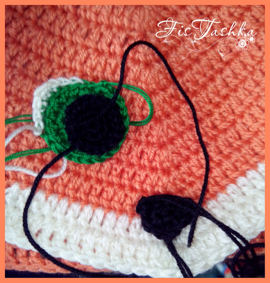 Далее с помощью столбиков без накида соединяем части уха, вначале используем оранжевую нить и чуть не доходя до черной части внешнего уха используем черную нить