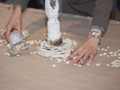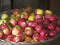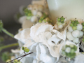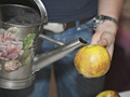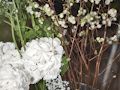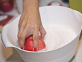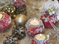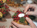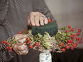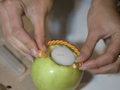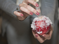 Для зимнего декора лучше выбрать яблоки красного или алого цвета], с которым ассоциируются и костюм Деда Мороза, и гроздья рябины, висящие на деревьях под шапками снега. Они будут единственным ярким элементом в композиции, где остальные детали белые и серебристые либо темные. Техника работы с фруктами похожа на осеннюю: сначала специальным ножом в яблоках делают углубления (1). Затем плоды покрывают клеем и опускают в декоративный искусственный снег, который искрится на свету не хуже натурального и при этом не тает (2). Далее в углубление вставляют пробирку с водой (3) и наполняют ее флористическими материалами - цветками белой гортензии, ветвями снежноягодника и кохии (4). Соцветия гортензии напоминают собранный в горсти рыхлый пушистый снег.