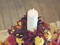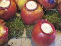 , и даже совсем неожиданные вещи - скажем, обычные яблоки (1). В крупных плодах при помощи специального ножа нужно сделать углубление и погрузить в образовавшиеся полости флористические пробирки. Подберите для каждого сезона несколько растений, способных рассказать о выбранном времени года посредством окраски и фактуры своих цветов и листьев. Осени подходят все виды, листва, цветы, плоды или ягоды которых полыхают оттенками желтого, оранжевого и красного: георгины, шиповник, калина, анигозантус, девичий виноград и клен (2). Годятся вообще любые яркие листья, радующие глаз в осеннем лесу. Выбранные материалы в различных комбинациях расставляют в яблочных "вазах", не забыв предварительно наполнить их водой (3, 4). Крупный подсвечник обильно украшают цветами и листьями (5, 7). Из яблок можно сделать и крошечные подсвечники, закрепив в них небольшие свечи и окружив природным декором из ягод калины и мха (6)