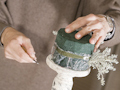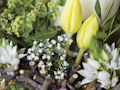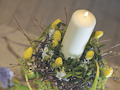 Цвет майской зелени - пожалуй, самая запоминающаяся краска весны. Этот оттенок - нечто среднее между салатовым и желтым, и в языке для него до сих пор нет более точного названия, чем "цвет майской зелени". С легкой дымкой свежего наряда на пробуждающихся после зимнего сна деревьях и кустарниках ассоциируются салатовые яблоки, которые используют для создания сосудов и подсвечников. Весенние цветы легки и воздушны - в композиции подобное ощущение передают алхенелла, гипсофила, орнитогалум. Ароматы этого времени года распространяют гиацинты. При оформлении высокого подсвечника используют также голые ветви и тюльпаны - два неизменных атрибута весны (1). В апреле - мае в землю опускают семена и затем ждут всходов, поэтому фоном для композиции служат рассыпанные семена тыквы как символ продолжения жизни и будущего плодородия (2). Свечи украшают тесемкой солнечного оттенка (3).