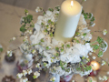 Большие подсвечники - центр каждой композиции. Их декорируют так: сначала на опоре закрепляют флористическую губку (оазис), в которую по окружности вставляют растения (5, 6), а сверху - свечу. Растения размещают густо, чтобы вокруг свечи образовалась пышная цветущая "юбка" (7). Из плотной массы цветков гортензии то здесь, то там выглядывают ветви с плодами снежноягодника - получается своего рода фейерверк. Поверхность стола посыпают искусственным снегом, в центре ставят нарядный подсвечник. Вокруг него хаотично размещают яблоки-вазы и яблоки-подсвечники, а также сосновые шишки и шары для новогодней елки - все вместе они создают особую волшебную атмосферу зимы, зимних праздников. Стоит зажечь свечи, и праздничное настроение усилится во сто крат: колеблющееся пламя привносит оживление, делает комнату уютной и словно даже согревает - легко вообразить, что сидишь у камина и завороженно смотришь на огонь.
